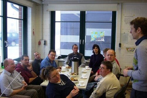 Herzlichen Glückwunsch an Herrn Schmidt zum erfolgreichen Abschluss der Berufsbildungszeit in der Greifenwerkstatt. Er absolvierte seine Berufliche Bildung zunächst im Arbeitsbereich Büroservice und dann im Atelier der Greifenwerkstatt. Besonders interessant und deshalb hervorzuheben, ist sicher das Praktikum im Institut für Mikrobiologie der Ernst-Moritz-Arndt-Universität. Herr Schmidt wird nun mit einem Vertrag in der Hand als Mitarbeiter im Atelier beginnen. Alles Gute und viel Erfolg wünschen ihm mit einer kleinen Feier seine Kollegen, die Fachkräfte und der Integrationsfachdienst!