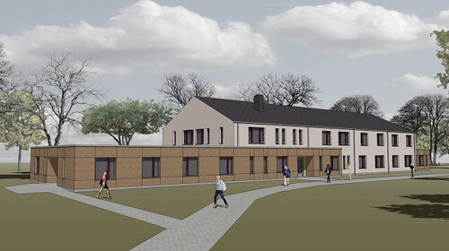 Für die Zeit der Bauphase werden diese Bewohner des Ernst-Moritz-Arndt-Heimes ab Januar 2016 in der Ersatzeinrichtung in der Rugardstraße 12 in Bergen wohnen. Die Bauzeit beträgt ca. 18 Monate. Der Einzug in das neue Wohnheim ist für das III. Quartal 2017 geplant.