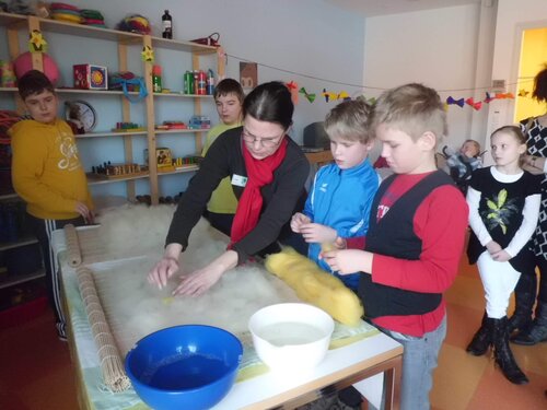 Auf dem Programm standen Bastelaktionen, wie z.B. das Filzen. Dieses wurde durch Frau Stein und Bewohner der Therapeutischen Wohngruppe durchgeführt. Beim Filzen konnten Groß und Klein ihre Fähigkeiten und Fertigkeiten, sowie ihre Kreativität präsentieren.