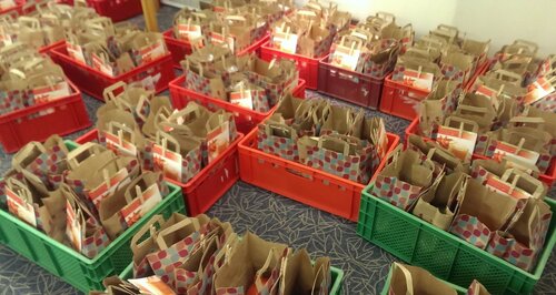 231 sogenannte Feierabendtüten verpacken, beschildern und ausliefern. Vorher galt es die entsprechende Menge an Kürbis und Ingwer zu portionieren und mit den weiteren Zutaten für eine vegetarische Kürbiskremsuppe zusammenzustellen.