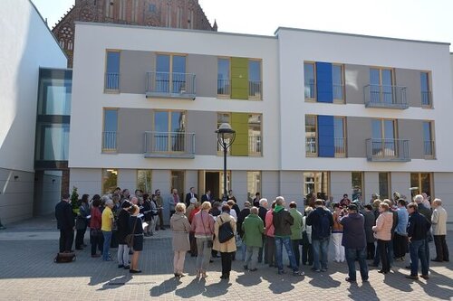 Für die „Sonnenseite“, die sich seit 19 Jahren kontinuierlich als Anlaufpunkt für vielfältige psychosoziale Angebote in der Hansestadt etabliert hat, beginnt nun ein neues Kapitel. Ganz zentral gelegen, zwischen Rathaus und St.-Bartholomaei-Kirche, beziehen Tages- und Begegnungsstätte die modernen Räumlichkeiten im Erdgeschoss des Neubaus. In den oberen Etagen befinden sich zudem zahlreiche Wohnungen für seniorengerechtes und barrierearmes Wohnen. Der Pommersche Diakonieverein e.V. hat damit erneut ein Angebot für Teilhabe und Teilsein direkt im Stadtzentrum eines Standorts positioniert - und damit in der Mitte der Gesellschaft. Darauf ging auch Vorsteher Dr. Michael Bartels in seiner Ansprache ein. „Es spielte bei der Entscheidung für dieses Projekt sicherlich auch eine wichtige Rolle, dass wir an anderen Orten bereits gute Erfahrungen mit zentralen Standorten gemacht hatten. […] Wir können an diesem symbolischen Ort lernen, dass die viel beschworene Inklusion damit steht und fällt, wie es um die gesellschaftliche Integrationskraft bestellt ist.“