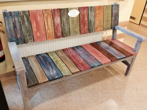 In die engere Wahl kam das Anfertigen einer schlichten Gartenbank mit individuellen Gestaltungsmerkmalen, die mit effektivem, ökonomischem und verwertbarem Material aus Abschnitten und Restmaterialien kreiert werden sollte. Hinzu kam die Aufgabe für unsere Mitarbeiter, einen innerbetrieblichen Partner zur Umsetzung dieser Aufgabe zu finden. Unsere Fördergruppe wurde vorgeschlagen und in das Projekt für die Gestaltung und Umsetzung der kreativen farblichen „Abstimmung“ einbezogen.