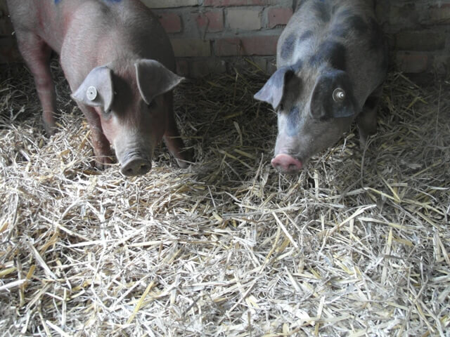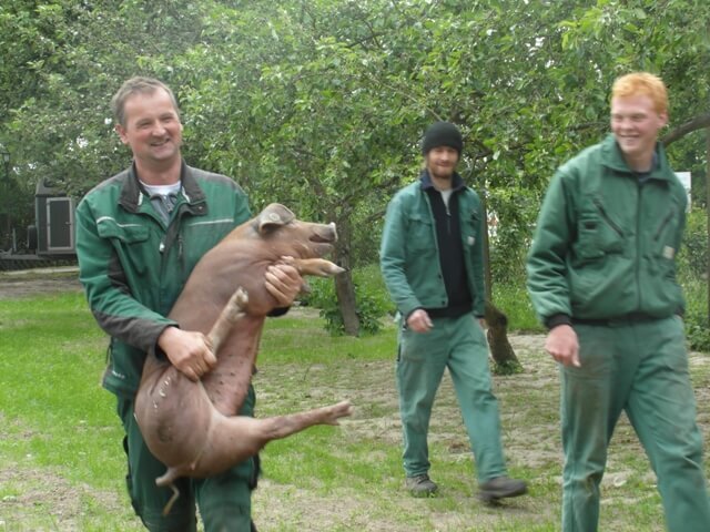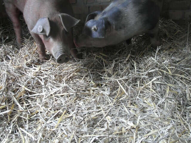 Bei unseren Tieren handelt es sich um die Kreuzung zwischen Pietrain (Vatertier) und Duroc. Hier werden die Vorzüge der alten Rassen wie zum Beispiel beste Fleischbeschaffenheit, Geschmacksintensität, geringer Fettanteil sowie hohe Belastbarkeit, Stressstabilität und gute Vitalität genutzt.