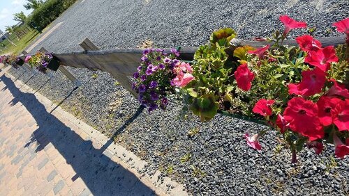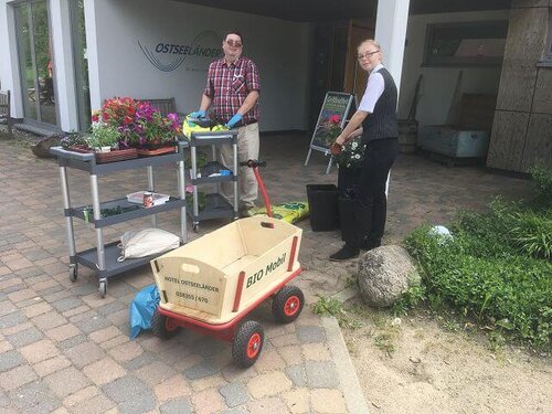 Der Frühling ist in vollem Gange und auch wir wollten unseren Ostseeländer Bio-Hofladen & Café auf dem Rasthof in Züssow rundherum ein wenig mit Blumen zum Blühen bringen. Also wurden 45 Pflanzen und insgesamt 320 l Blumenerden in Stand- und Hängekästen verteilt. Herr Waldow und Frau Bineider haben den grünen Finger. Sie pflanzten Petunien, Geranien, Mäuseschwänzchen, Weihrauch, Mittagsblumen und vieles mehr. Jetzt nur noch fleißig gießen…kommen Sie und schauen Sie selbst.