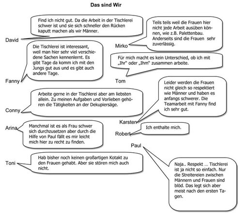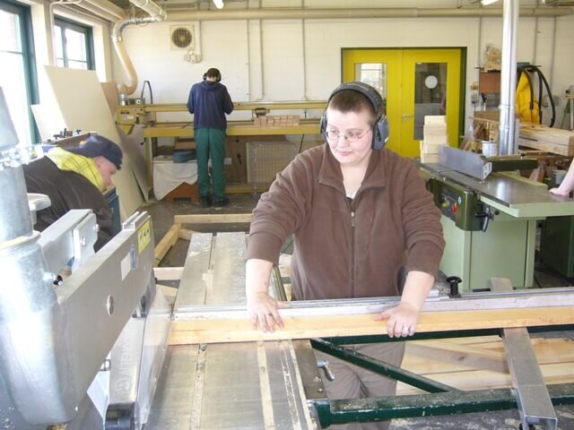 Momentan sind zwei Mitarbeiterinnen im Arbeitsbereich tätig, eine weitere Teilnehmerin absolviert ihre Berufliche Bildung in der Tischlerei und eine weitere erprobt sich gerade im Rahmen eines Praktikums. Die Zahl der weiblichen Mitarbeiterinnen steigt stetig und wir sind bemüht eine gute Arbeitsatmosphäre für alle zu schaffen und jedem Interessenten, egal ob Frau oder Mann, einen Einblick zu ermöglichen oder gar einen Arbeitsplatz bereitzustellen. Und wenn man uns fragt, wer wir eigentlich sind, antworten wir: „Wir sind eine junge Gruppe in einem Bereich der abwechslungsreicher und interessanter nicht sein könnte.“
