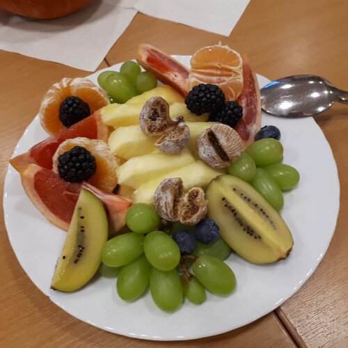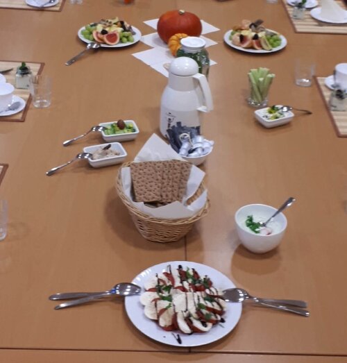 Auf der herbstlich eingedeckten Besprechungstafel hatten wir eine Vielfalt an leckeren Speisen bereitgestellt. Knäcke- und Roggenvollkornbrot mit Kräuterquark, körnigem Frischkäse mit Gurken, Kräutern und Paprika, Dattel-Walnussfrischkäse, Avocado-Dipp sowie Tomate-Mozzarella mit Balsamicoglace. Besonders begehrt waren unser Obstsalat mit Mandarinen, Ananas, Melone, Grapefruit, Kiwi, Heidelbeeren, Brombeeren, Feigen und Weintrauben sowie der geschichtete Himbeerquark mit Müsli. Frisches Minzwasser und Kräutertee als Alternative zum klassischen Morgenkaffee.
