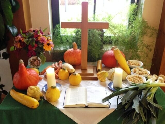 Wir erinnerten uns in der Erntedankandacht daran, wer die Kürbisse gemacht hat, was sie wachsen lässt, wer Sonne und Regen schickt und dass es mit den Menschen ähnlich wie mit Kürbissen ist. Egal, wie man aussieht, der Herr hat uns gut gemacht und wichtig ist, was drinnen steckt.