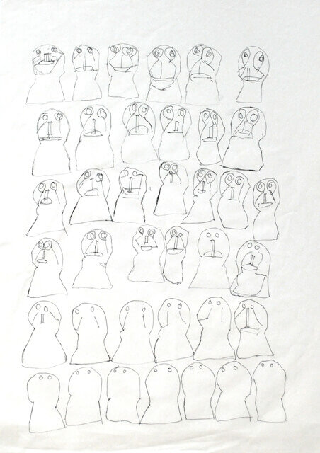 Ab Reihe fünf besitzt nur noch ein Gesicht einen Mund, nur zwei Köpfe haben noch eine Nase, der Rest der Figuren besteht nur aus zwei Augen und Wangenknochen. In der letzten Serie zeichnete Anette Völker in ihre Figuren lediglich nur noch zwei Augen ein, die nun ganz nach oben in die Nähe der Schädeldecke gerückt sind, die Körper wie Gespenster aussehen lassen. Dieser gespensterhafte Eindruck beginnt bereits in der Linie zuvor. Gespenster, die jedoch nicht unmittelbar angst einflößend auf mich wirken. Ich finde die beiden Augen unter ihren weißen Betttüchern (so blicken sie) eher neugierig und beobachtend in die Welt schauend.
