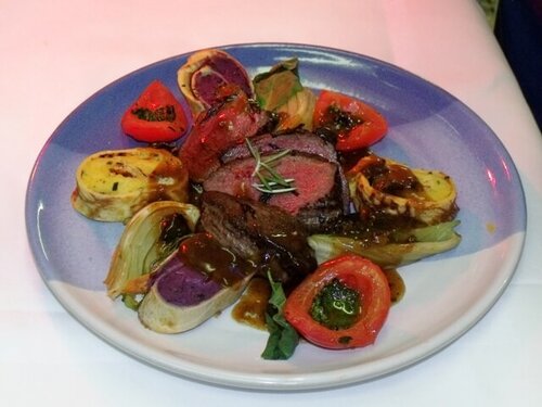Medium gebratenes Straußenfilet auf gegrilltem Fenchel-Tomatengemüse Angerichtet an einer Morcheljus mit einem Duett vom Kartoffelcrépes