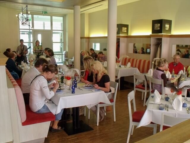 Unser Restaurant begrüßte die Gäste an weiß gedeckten Tischen, liebevoll durch den Service mit festlichen Servietten und roten Tulpen geschmückt. Diese waren raffiniert in ausgeblasene Straußeneier gesteckt und mit herrlichen Straußenfedern dekoriert.
