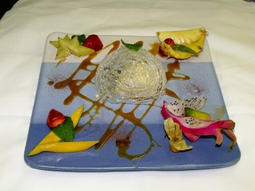 Krem Karamell vom Straußenei auf parfümiertem Obst unter einem Zuckernest