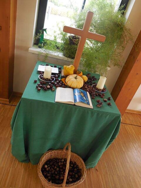 Herr Biederstädt leitete mit einem herbstlichen Stück auf der Blockflöte die Andacht ein. Der Glaubenskurs spielte im Anschluss daran eine Frühstücksszene nach, in welcher das Hauptthema der Andacht dargestellt wurde. Es ging dabei um gegenseitiges Helfen und auch um das Willkommen heißen von Fremden, welche in Deutschland Schutz und eine neue Heimat suchen.