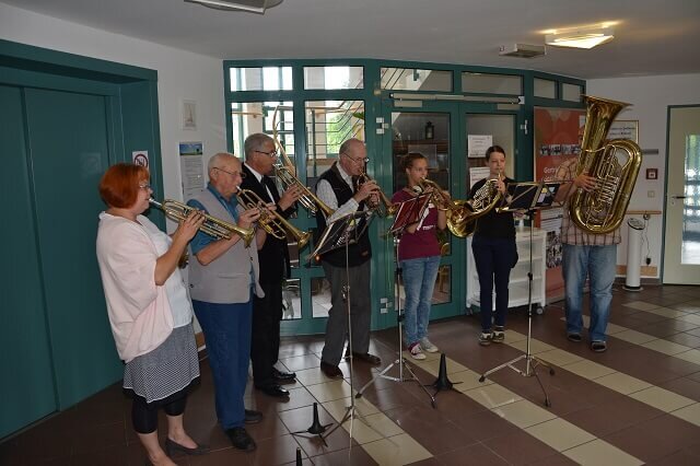 Zuvor gab es aber noch eine gemeinsame Feierstunde mit zahlreichen Gästen: Kurt Kunze als Vertreter der Stadt brachte Glückwünsche von Bürgermeister Dr. Michael Koch und von Ministerpräsident Erwin Sellering mit. Pastor Martin Wiesenberg hielt eine Andacht, der Demminer Posaunenchor spielte auf und die Kinder des evangelischen Kindergartens „Kleine Füße von St. Bartholomaei“ erfreuten alle Gäste und Jubilare mit ihrer Darbietung. Große Begeisterung löste auch Küchenchef Dietmar Haas mit seiner Zitronen-Buttercreme-Torte aus. Die schmeckte auch den anwesenden Vertreterinnen der Bewohnerschaft, der Presse und der AOK. Auch der jüngste Gast, Frau Werners Urenkel, durfte von dem aufwendig verzierten Backwerk naschen.