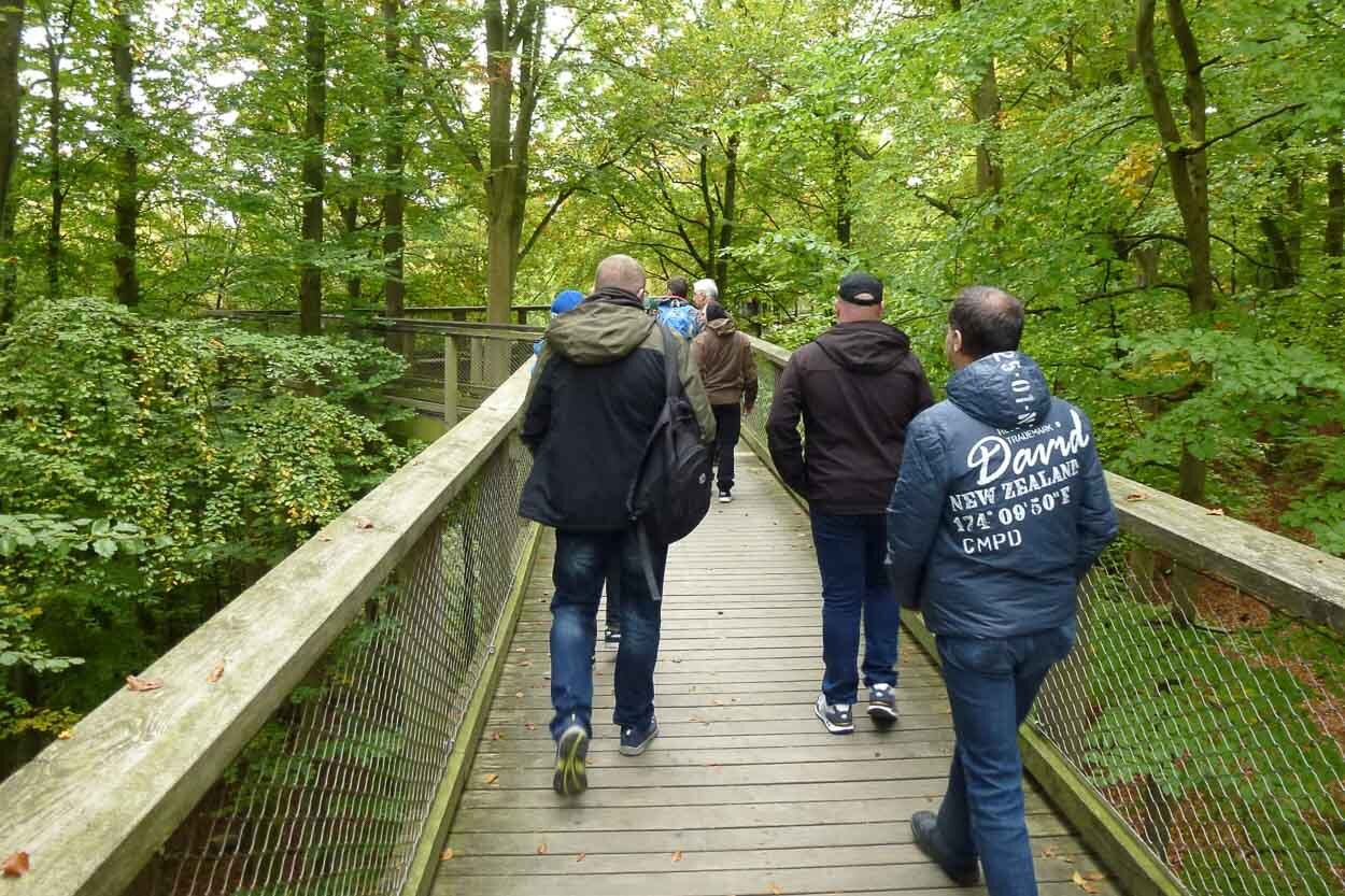 Nachdem sich alle wieder versammelt hatten, ging die Fahrt weiter nach Prora. Unsere Reisegruppe hatte sich vorgenommen, den Baumwipfelpfad mit einer Länge von 1250 Metern zu erkunden. Den Höhepunkt des Pfades bildete der 40 Meter hohe Aussichtsturm „Adlerhorst“, von welchem aus man einen einzigartigen Rundblick über die Insel Rügen, den Kleinen Jasmunder Bodden und die Ostsee erlangt. Da der Aufstieg bei schönstem Wetter doch so manchen aus der Puste gebracht hatte, kam die Möglichkeit, die 52 Meter lange Tunnelrutsche für den Rückweg zu nutzen, unseren Mitarbeitern sehr gelegen. Unten am Ziel angekommen sah man viele lachende Gesichter. Nach circa 3 Stunden Wanderung stiegen wir erneut in die Autos und fuhren noch ein Stück weiter in die Nähe von Putbus, um den anhaltenden Sonnenschein auszunutzen und am Strand spazieren zu gehen. Hier hatten die Mitarbeiter die Möglichkeit, sich einmal abseits unseres Werkstattalltags zu unterhalten und sich besser kennen zu lernen.