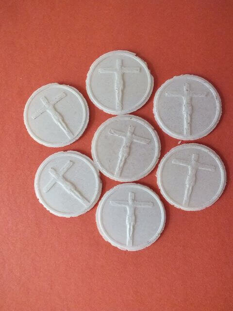 Die Hostien, als Bestandteil des kirchlichen Abendmahles, sind dünne Oblaten, die bereits seit dem 8./9. Jahrhundert als Ersatz für das früher zur Feier des Herrenmahls mitgebrachten Alltagsbrots dienen. Typisch für die Hostie ist die feine Prägung mit einem christlichen Motiv. Unsere Hostie stellt das Symbol des gekreuzigten Jesus dar.