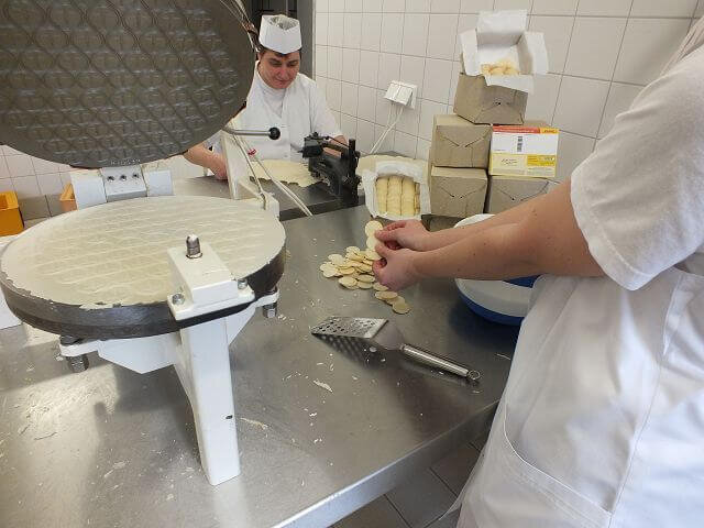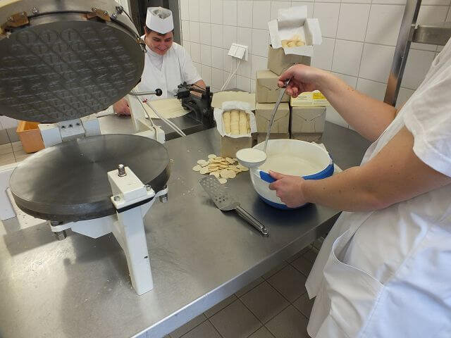 Im Züssower Arbeitsbereich Hauswirtschaft ist bereits seit 21 Jahren unsere Hostienbäckerei integriert. Wenn die Zutaten auch nur Wasser und Mehl sind, erfordert es viel Fingerspitzengefühl, bis aus einem flüssigen Teig eine knusprige kleine Oblate entsteht.