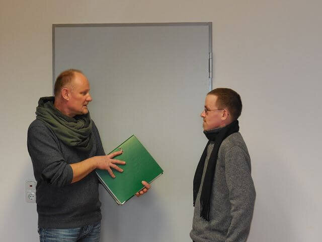 Herr Finger als Bildungsbegleiter übergab den Bildungsordner, in dem sich über die vergangenen beiden Bildungsjahre eine Menge Wissen gesammelt hat. Und dieses fachliche Know-how kann Herr Witt nun täglich in der Arbeitspraxis beweisen.