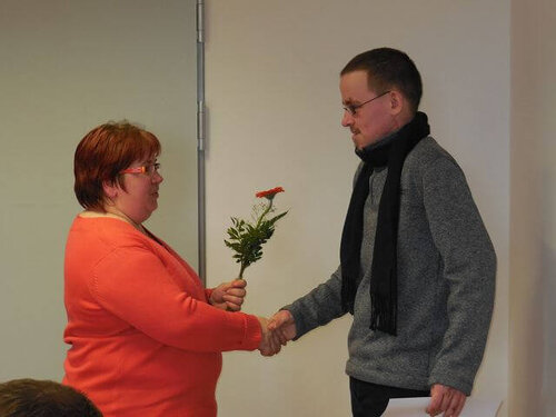Frau Welke hieß Herrn Witt als neuen Mitarbeiter im Namen des Werkstattrates willkommen und hatte einen kleinen Blumengruß dabei.