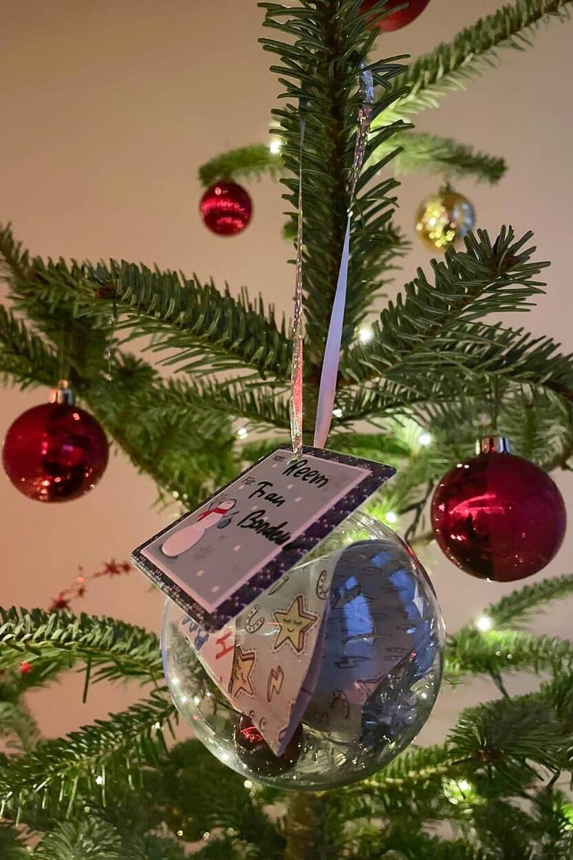 Für eine Spende konnte eine von den Kindern und Jugendlichen mühevoll selbst gestaltete Weihnachtswunschkugel erworben werden. Diese kann dann gerne den eigenen Weihnachtsbaum schmücken. Ob man selbst ein Geschenk kaufen möchte oder lieber nur eine Geldspende geben möchte, durfte selbst entschieden werden. Wichtig ist einzig, dass die Kinder zur kleinen Weihnachtsfeier am 15.12.2021 alle ein schönes Geschenk auspacken dürfen.