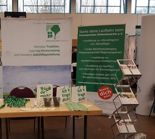 JOBBEX 2018 - da durften wir natürlich nicht fehlen. Der Pommersche Diakonieverein e.V. stellte auch in diesem Jahr seine attraktiven Ausbildungsmöglichkeiten in den Bereichen Pflege, Verwaltung und Hotellerie vor und lockte damit zahlreiche Interessierte an seinen Info-Stand. Die fachkundige Beratung überzeugte einige Veranstaltungsteilnehmer gleich vor Ort, sich um einen Ausbildungsplatz bei uns im Verein bewerben zu wollen. Künftige Azubis, wir freuen uns auf Euch!