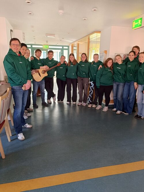 Am 20. März 2025 haben 12 Jugendliche und 2 Betreuer mit ihren Stimmen und Instrumenten Freude in die Gesichter der Bewohner des Gertraudenstiftes gezaubert. Sie sangen nicht nur schwungvolle christliche Jugendlieder, sondern luden die Bewohner*innen auch dazu ein, mit ihnen gemeinsam „Nun danket allen Gott“ zu singen und den Psalm 23 zu beten.