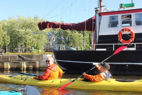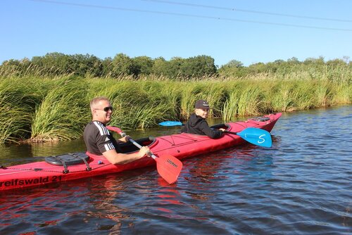 Begleitet von Herrn Mahlitz, IGT Partnerschaft mit dem GB arbeiten, erhielten alle zu Beginn eine kurze Einweisung in die Paddeltechnik und Einstellen der Boote. Anschließend ging es in Zweier-Kajaks aufs Wasser. Die Route führte vorbei an grünen Ufern, historischen Gebäuden und bot einen einmaligen Blick auf die maritime Seite Greifswalds. Die Tour bot genügend Momente zu Gesprächen im Boot, Feilen an der Paddeltechnik, denn nicht allen Teilnehmern/innen gelang es das Kajak auf geraden Kurs zu halten. Zum Teil kollidierten wir anfangs mehr mit der Uferböschung und pflügten den Ryckuntergrund dermaßen auf, dass uns die Seerosen und Algen um die Ohren flogen.