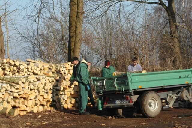 Zwei Mitarbeiter sind im Besitz des Motorkettensägescheins und unter Anleitung auch für qualifizierte Arbeiten einsetzbar. Aber nicht nur das Sägen gehört zum Holzgeschäft. Beräumen, Holz abfahren und auf dem Mietenplatz stapeln sowie die Paletten für den Verkauf bestücken sind wichtige Arbeitsschritte.