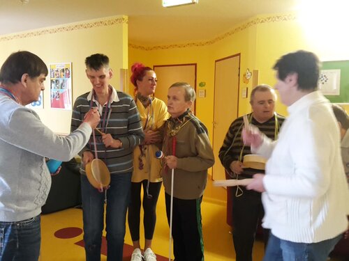Alle Bewohner finden sich im Therapiebereich zusammen und starten von dort aus, kostümiert und mit Musikinstrumenten, zum Umzug durch das ganze Haus. Gemeinsam gehen wir über die Bereiche und laden jeden ein, am Umzug teilzunehmen und mitzumachen.