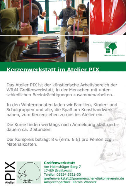 Das Atelier PIX erweitert über die Wintermonate traditionell wieder ihr Angebot. Wir laden ganz herzlich Familien, Freunde, Kinder- und Schulgruppen in unsere Kerzenwerkstatt ein. Jeder der Spaß hat am Kunsthandwerk, kann sich beim Kerzenziehen erproben und seine ganz individuellen Kerzen kreieren.