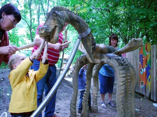 Christine Scheel, Leitende Erzieherin des Kinderladens Greifswald e. V., ist beigeistert: „So eine Figur habe ich mir schon immer gewünscht. Meine Klangstrecke aus Metallteilen musste ich abnehmen, da sie zu laut für die Anwohner wurde. Es ist eine echte Bereicherung, da eine Klangskulptur mit vielen Möglichkeiten zur Klangerprobung auf schönste Weise in kindgerechter Aufarbeitung entstanden ist. Unser Dino heißt jetzt ‚Musikdrachen Gogul’, den Namen haben sich die Kinder ausgedacht.“