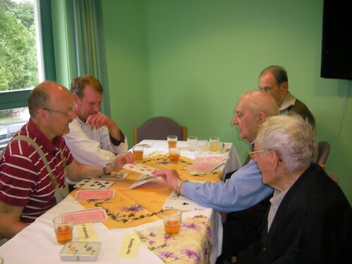 Einen Tag vor Christi Himmelfahrt wurden die Bewohner unseres Hauses von der PDL und RGL zu einer „Männerrunde“ mit Kaffee, Kuchen und Spiel, eingeladen. Der Hausmeister sowie Herr Burmeister aus der Küche verstärken die Runde, da auch eine Partie Skat gespielt werden sollte. Nach dem gemeinsamen Kaffeetrinken ging es dann los, die Skatkarten wurden ausgepackt, ein Quartett mit Bilder von Städten in M-V gemischt und das Spiel „Mensch ärgere dich nicht“ auf den Tisch gestellt. Alle waren mit großem Eifer dabei und jeder wollte gewinnen, so dass die Zeit wie im Flug verging. Zum Abschluss waren sich alle einigt, dass dies nicht die letzte gemeinsame Männerrunde im Gertraudenstift ist.