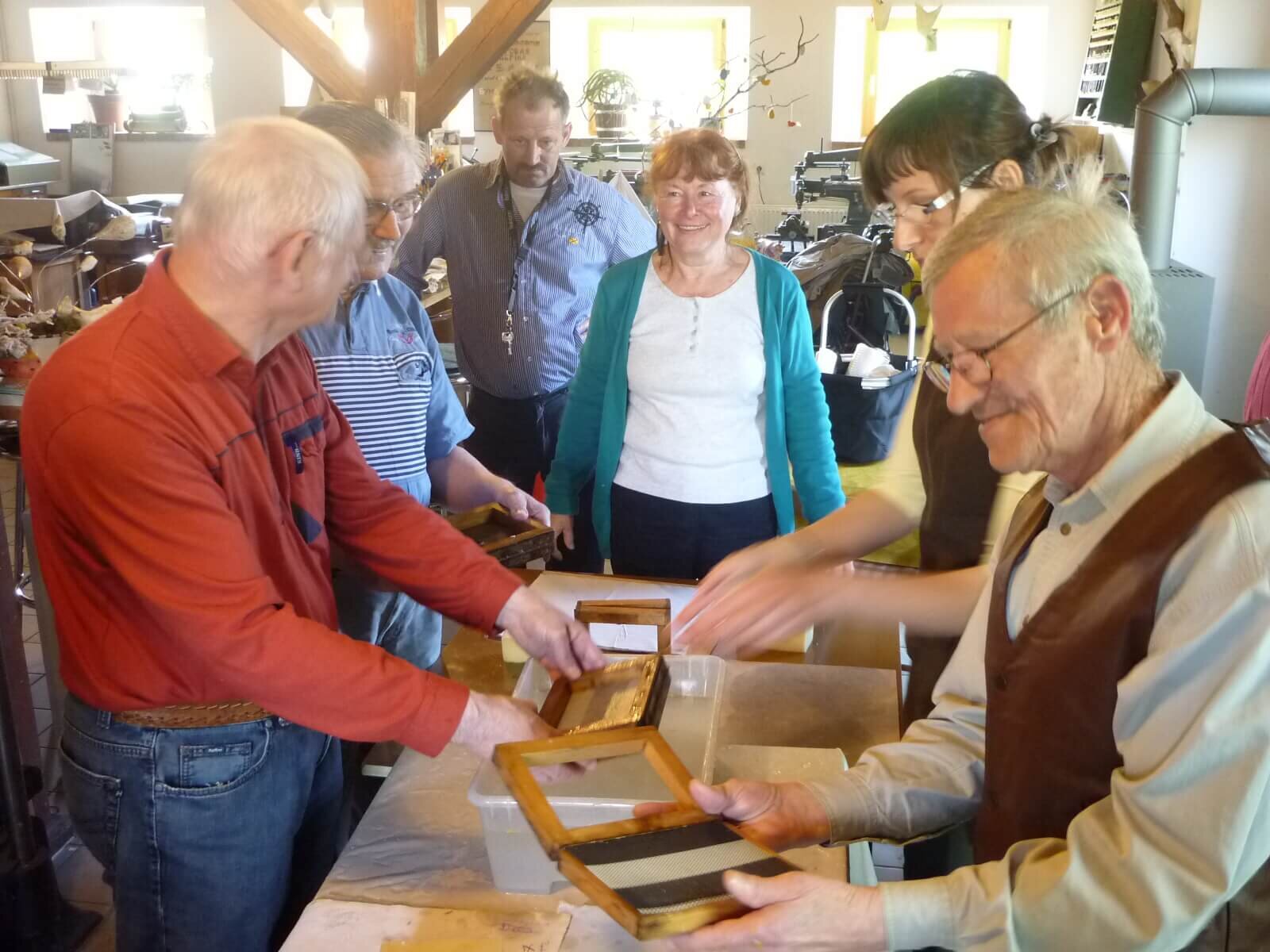 Nach einer kleinen Führung durch das vom Schafstall zur Papiermanufaktur umgebaute Gebäude, erklärte uns Frau Kautz die Arbeitsschritte des Papierschöpfens.