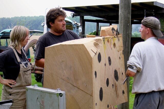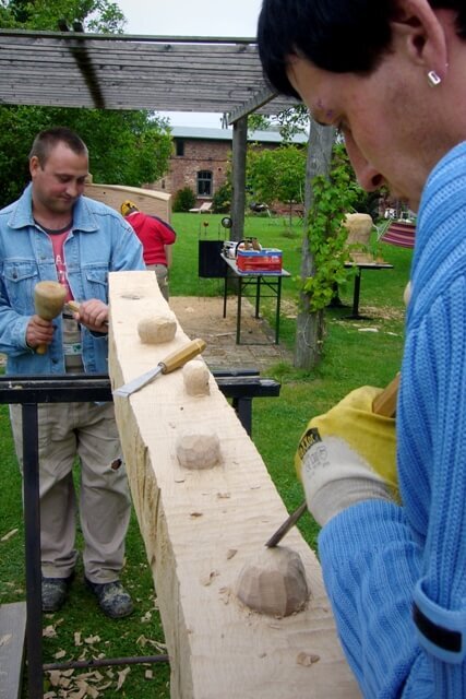 So erleben die Teilnehmer des Holzworkshops mit André Kalunga-Peters das zauberhafte Kleinod des Künstlers in Friedrichshagen. Mit Freude machen sich die Teilnehmer morgens auf den Weg zum Grundstück des Künstlers. Dort angekommen, verwandeln sich die 6 Teilnehmer unter Anleitung von André Kalunga-Peters in „emsige Holzwürmer“. Es wird geschliffen, gespalten, gehobelt und natürlich fallen dabei jede Menge Späne. Besonders, wenn der Künstler zur Kettensäge greift. Unter dem staunenden Auge des Betrachters entstehen so ein Riesen-Käse mit einer Maus, ein Apfel, eine Bank zum Balancieren und mehrere Holzgestalten, die später ihren Platz auf dem Rondell vor dem Hofcafé/ Ostseeländer in Züssow finden werden. Dort werden sie zum Verweilen und Staunen einladen. Besonders Kinder sollen sich daran ausprobieren, Neues entdecken oder einfach Freude haben. Und sie werden dort ein dauerhaftes Zeugnis sein, für die Kreativität, den Gestaltungswillen und den Spaß, den alle Teilnehmer an diesem Workshop hatten.