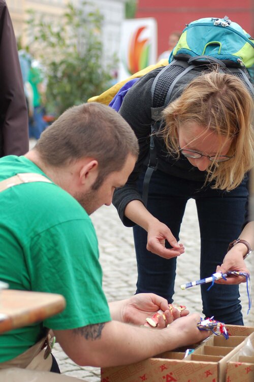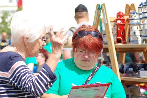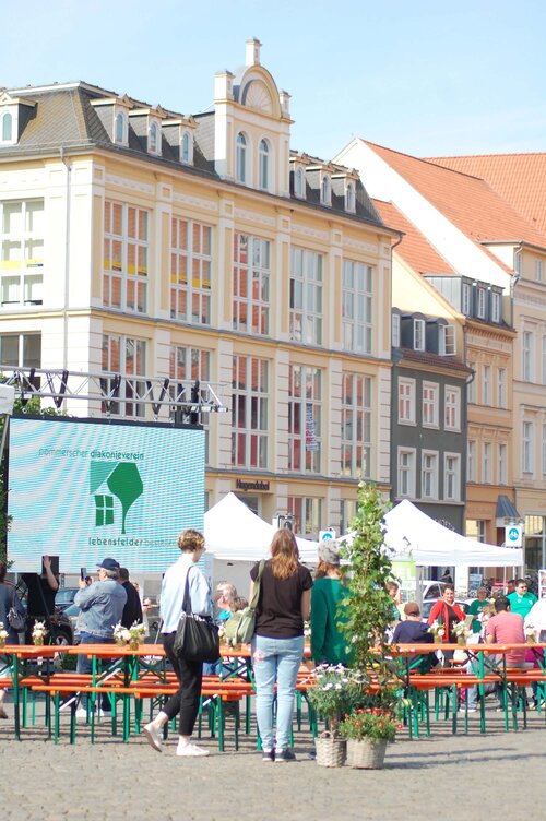 Auch in diesem Jahr fand der Markt der Vielfalt wieder zentral auf dem Greifswalder Marktplatz statt. Der Pommersche Diakonieverein präsentierte in diesem Rahmen seine vielfältigen Dienstleistungen, Arbeitsangebote und Eigenprodukte. Kathleen Welke, Werkstattratvorsitzende der Greifenwerkstatt, und deren Stellvertretung Franziska Witt zogen über den Markt, um mit den Gästen ins Gespräch zu kommen und sich über Meinungen und Erfahrungen auszutauschen. Aufmerksam auf den Markt der Vielfalt sind die Gäste auf vielfältige Weise geworden. Großformatige Plakatwerbung im Bus, Aushänge in den Arbeitsbereichen und im Bürgerhafen, aber auch die Werbebanner an der Straße weckten das Interesse der neugierigen Greifswalder. Alltagsrelevante Arbeitsangebote wie die der Fahrradwerkstatt und die kreativen und vielfältigen Eigenprodukte insbesondere der Näherei und Keramik begeisterten die Kunden und luden zum Shopping ein.