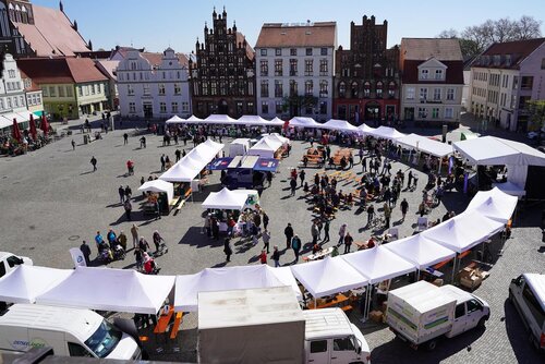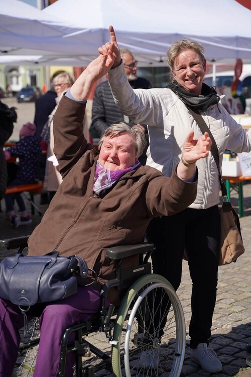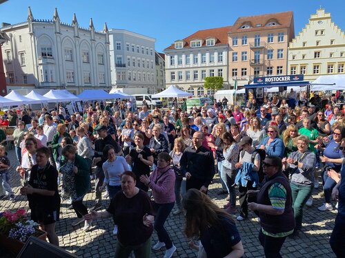 Highlight der Veranstaltung war die diesjährige Stadtwette. Wir haben gewettet, dass wir es schaffen 101 Personen (von 0 bis 100+ Jahre) vor unsere Bühne auf den Greifswalder Markt zu locken und mit uns gemeinsam zu Uptown Funk zu tanzen. Eine Choreographie wurde im Vorfeld mit der Tanzschule D&D erarbeitet und konnte auch noch am Markttag am Stand des Dienstes zur betrieblichen Inklusion geübt werden. DJ Thomas Wodrig motivierte viele Unentschlossenen im Verlauf des Tages nocheinmal an der Stadtwette teilzunehmen, so dass die Unternehmensgruppe Pommersche Diakonie um 16 Uhr sagen konnte: Tanzend, verbindend Energie erzeugt - Wette geschafft!