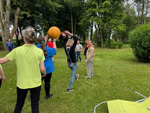 Statt der üblichen Kaffeepause wurde die Gelegenheit genutzt, um gemeinsam aktiv zu werden. Pierre zeigte sich erfinderisch: Anstelle eines einzelnen Balls wurden gleich drei Bälle gleichzeitig verwendet. Mit 20 Teilnehmern war das Ziel klar. Wer kann werfen, fangen und die Bälle über Kopf weiterreichen? Die Herausforderung führte zu viel Gelächter und guter Laune, denn die angesagten Richtungswechsel sorgten für einige lustige Momente.