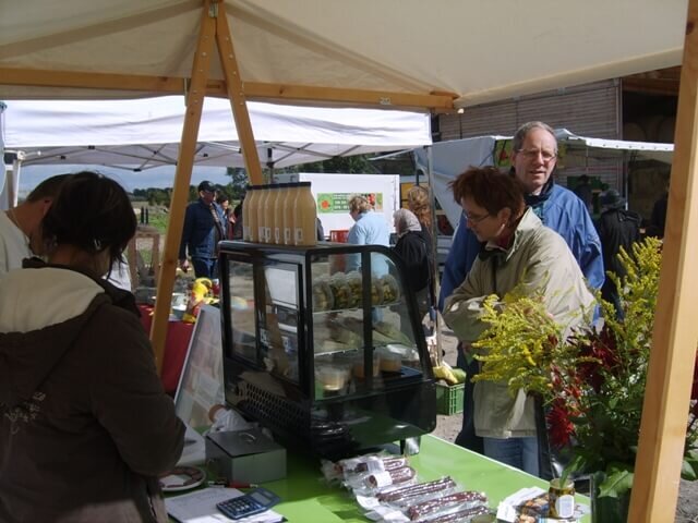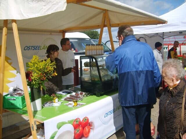 Als wir gegen 09:30 Uhr auf dem Hofplatz ankamen, waren unsere Stände schon aufgebaut und wir konnten sofort mit den Vorbereitungen loslegen: Die Käsetheke wurde mit verschieden Sorten bestückt z. B. schnittiger, würziger, marinierter und frischer Ostseeländer sowie leckerer Apfelmolke. Außerdem hatten wir Hirtensalami und Landknacker im Angebot. Wir dekorierten den Stand des Flechtwerks u. a. mit Körben, Rankhilfen und lustigen Fischen.