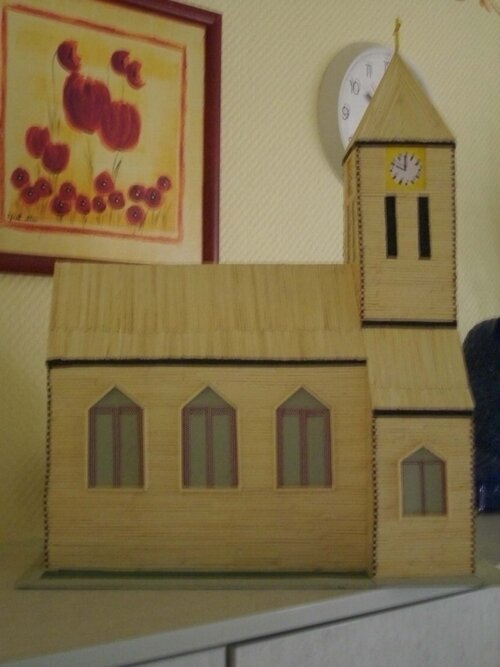 Aus einem Schuhkarton wurde das Grundmodell gefertigt. Dieses wurde den Bewohnern und Mitarbeitern gezeigt und von allen für gut befunden. Bei der Beschaffung des notwendigen Materials, wie Streichhölzer, Pappe und Kleber, wurde er von Mitbewohnern unterstützt. Täglich wurden 2-3 Stunden für den Bau der Kirche aufgebracht. Die gesamte Bauzeit betrug ca. drei Monate.