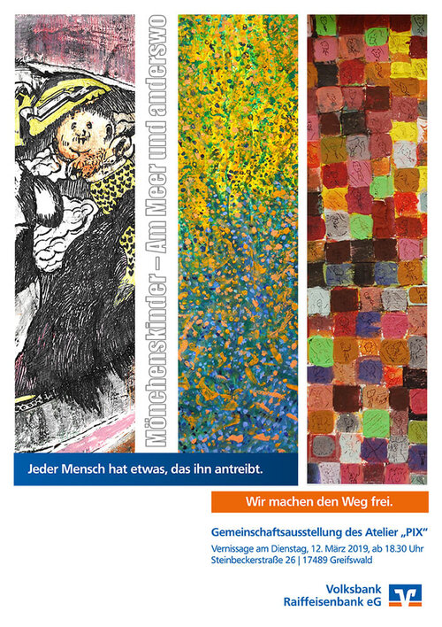 Der Titeleinstieg „Mönchenskinder“ ist eine humoristische Ableitung des Wortes „Menschenskinder!“ als Ausdruck des Erstaunens, kreiert von PIX-Urgestein OTTO. Denkt man an die Stadt Greifswald, denkt man fast unweigerlich auch an ihren berühmtesten Sohn Caspar David Friedrich. Von diesem haben wir uns zwar malerisch nicht unbedingt inspirieren lassen, aber doch zumindest thematisch eines seiner beliebten Elemente aufgegriffen. So steht im PIX´schen Fokus nicht der „Mönch am Meer“, sondern wir selbst – die Menschenkinder am Meer, all das, was uns umgibt und eben auch Orte, von denen wir selbst noch gar nicht wissen, das „Anderswo“.