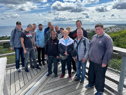 Unser erstes Ziel war der Baumwipfelpfad in Heringsdorf. Dort lernten wir nicht nur über den Aufbau von Bäumen und ihre lebenswichtige Funktion bei der Sauerstoffproduktion kennen, sondern konnten auch die verschiedenen Baumarten in unterschiedlichen Höhen erkunden. Vom Aussichtsturm in 33 Metern Höhe genossen wir einen atemberaubenden Blick auf die Küstenstruktur von Usedom sowie auf das Achterwasser und sogar bis nach Swinemünde in Polen.