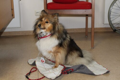 Hündin „Caja“ geht unterdessen mit Pflegedienstleitung Frau Voß und Besitzerin Martina auf eine besondere Mission. Da sie kleiner ist als die anderen beiden, besucht sie häufig Pflegebedürftige, die bettlägerig sind. Caja lässt sich ohne Einwände auf das Bett einer Bewohnerin setzen, legt sich hin und bleibt entspannt und geduldig liegen. Die besuchte Dame ist dement und ebenfalls kognitiv schwer beeinträchtigt. Sie kann sich nicht mehr mit Worten ausdrücken und schläft sehr viel. In Cajas Nähe öffnet sie für einen kurzen Moment die Augen und greift in das kuschelige lange Fell der Hündin. Caja lässt es geschehen, legt ihren Kopf auf die Bettdecke. Nach einer Weile im warmen Bett beginnt die Hündin leicht zu hecheln. Besitzerin Martina, die ein sensibles Gespür für ihr Tier hat, weiß: es ist Zeit für eine Pause. Nach ungefähr einer Stunde ist daher auch der Hundebesuch in der Einrichtung vorbei und die Vierbeiner werden mit kleinen Spielen im Freien und einem Spaziergang für ihre Arbeit belohnt.