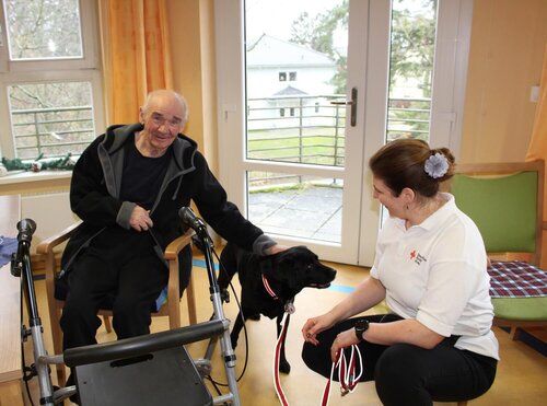 Da staunen die Bewohner:innen des Janczikowsyhauses in Züssow nicht schlecht, als am Freitagnachmittag ein unerwarteter Besuch im Gemeinschaftsraum des Erdgeschosses auftaucht. Pflegedienstleitung Kerstin Voß hat die „Besuchshunde“ vom Deutschen Roten Kreuz eingeladen. In Begleitung ihrer Besitzerinnen, die gleichzeitig auch das Training übernehmen, betreten die drei Hunde in freudiger Erwartung und mit wedelndem Schwanz die Einrichtung. Die 10 Jahre alte Hündin Kira, mit „Frauchen“ Verena, begrüßt als Dienstälteste zuerst einen Bewohner im Rollstuhl. Freundlich und aufgeschlossen geht die schwarze Labrador-Hündin auf ihn zu, schnüffelt erst ein wenig am Rollstuhl, dann an den Händen und lässt sich kurz darauf von ihrer neuen Bekanntschaft den Kopf tätscheln. Der Bewohner lacht und strahlt über das ganze Gesicht. Für die umstehenden Pflegekräfte ist das etwas Besonderes, denn der Mann ist kognitiv schwer beeinträchtigt und eine Kommunikation ist daher oft nur schwer möglich. „Aber Tiere, und vor allem Hunde, die haben da einen anderen Zugang.“, weiß Ausbilderin Christine Dembski, die die Gruppe begleitet, zu berichten. Auch Sheltie „Caja“ mit Besitzerin Martina und Australian-Shepherd-Rüde „Elvis“ mit seinem Frauchen Stephie sind zu Gast. Schon während der ersten Minuten fällt auf, dass es sich hierbei um ganz besondere Hunde handelt. Es gibt kein wildes Anspringen, kein Bellen oder Verstecken – trotz der fremden Umgebung, Menschen und Gerüche. Die drei Besuchshunde strahlen Ruhe aus, sind neugierig aber vor allem freundlich und kontaktfreudig. Ganz zum Vergnügen der Senior:innen. Viele von ihnen hatten früher selbst einen Hund. Einige, damit der Hof bewacht wird und andere, um einfach einen Weggefährten und Freund bei sich zu haben. So kommen bei vielen alte Erinnerungen zutage und die drei Vierbeiner müssen nicht lange auf die ersten Streicheleinheiten warten.