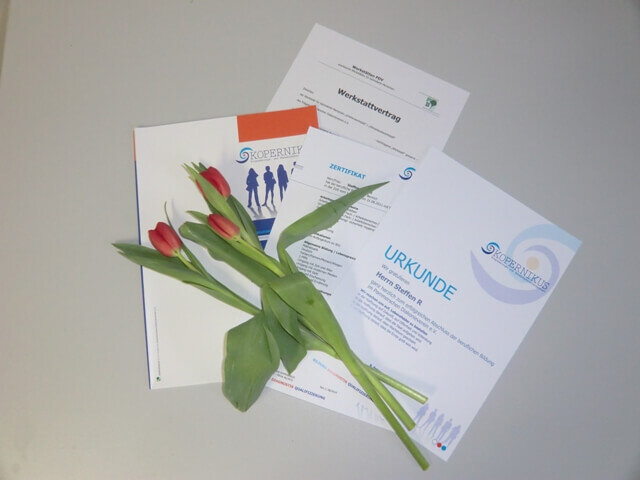 Mit dem Jahreswechsel 2011/2012 änderte sich für einen Teilnehmer von KOPERNIKUS auch sein berufliches Leben entscheidend. Er wechselte, nachdem er den 2-jährigen Berufsbildungsbereich absolviert hat, nun in den Arbeitsbereich. Herr P. Milz ist jetzt Mitarbeiter der Ostseelandwerkstatt in der Betriebsstätte Wolgast. Urkunde und Zertifikat, die ihm den erfolgreichen Abschluss seiner beruflichen Bildung bescheinigen, nahm er, im Rahmen einer Feierstunde mit den Kollegen und Fachkräften der Betriebsstätte, aus den Händen des zuständigen Sozialpädagogen des Integrationsfachdienstes entgegen. Der Fachbereichsleiter der Industriebereiche der Werkstätten des PDV e. V., Herr Karl Kuba, gratulierte ihm herzlich zu diesem wichtigen Schritt und überreichte Herrn Milz seinen neuen Werkstattvertrag.