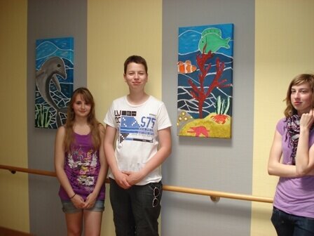 So wurde die Lehrerin für Kunsterziehung mit einbezogen und aktiv. Zusammen gestalteten sie im Fach "Kunsterziehung" die Bilder. Die Themen der Bilder sind u.a. "Unsere Sinne" bzw. Das Leben im Wasser".