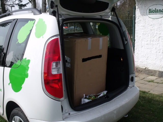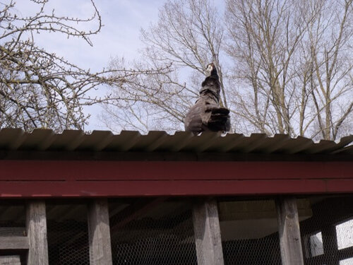 Vom Großstadt-Bauernhof auf die Bioland-Homefarm nach Züssow – willkommen sagt Sieglinde, erst mal noch vorsichtig vom Dach des Hühnerstalls.