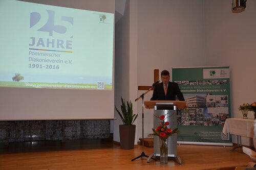 Der Vorsteher des Pommerschen Diakonieverein e.V., Dr. Michael Bartels, nahm in seiner Ansprache u. a. Bezug auf demografische und sozio-ökonomische Entwicklungstendenzen und Realitäten die die Vereinsarbeit und -entwicklung beeinflussten und auch künftig beeinflussen werden.