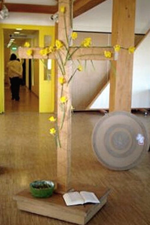 Es war eine sehr intensive Andacht mit einem schwarzen Tuch der Trauer, frühlingsgelben Osterglocken für die Frohe Botschaft und einem kleinen Holzkreuz für Herz und Hand. Die angedachten Gedanken wurden später auch im Flur und in den Arbeitsbereichen weitergedacht. Wir hoffen, dass in den einzelnen Arbeitsbereichen noch Nischen waren für gute Gespräche.