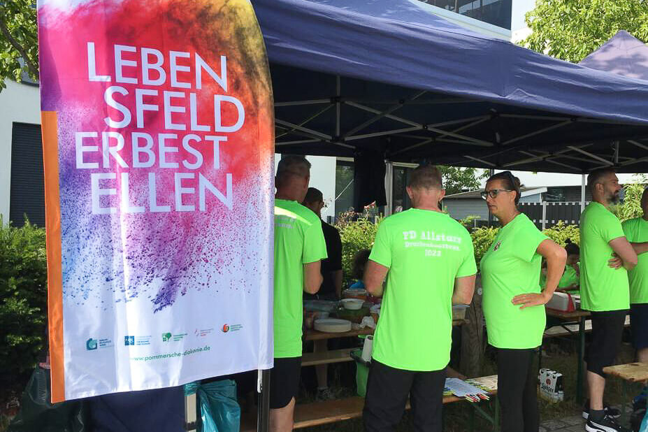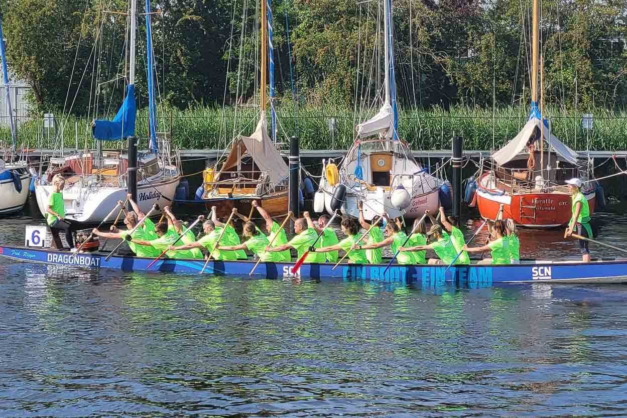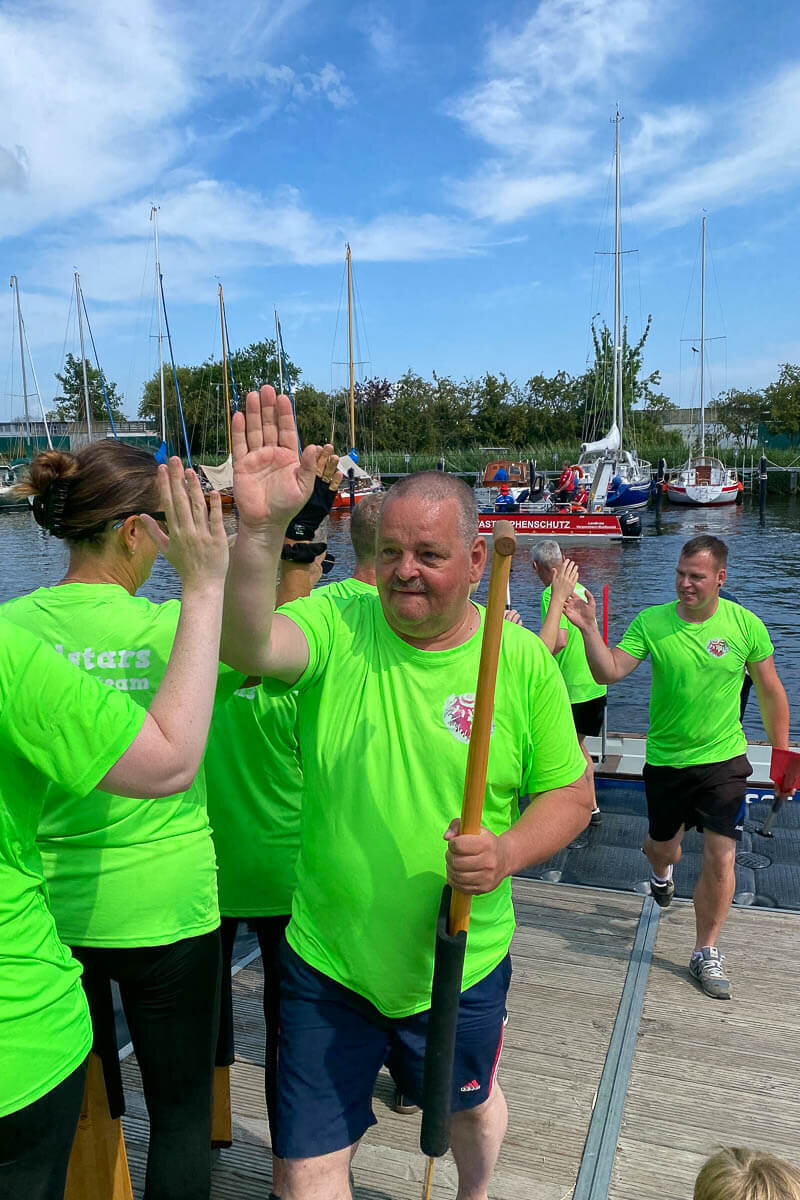Gemeinsam zum Sieg – die PD Allstars, bestehend aus einem bunten Teammix aus den Geschäftsbereichen der Unternehmensgruppe Pommersche Diakonie sind wieder beim Greifswalder Drachenbootfest an den Start gegangenen. Nach Wochen intensiven Trainings konnten die Kolleg*innen auf der Langstrecke über 1350m den 23. Platz und auf der Kurzstrecke über 250m den 10. Platz erreichen. Es war ein spannendes Rennen, bei dem sich das Team mit vollem Einsatz ins Ziel kämpfte.