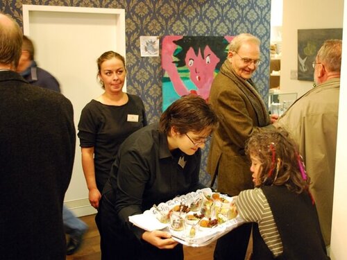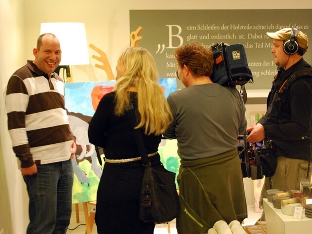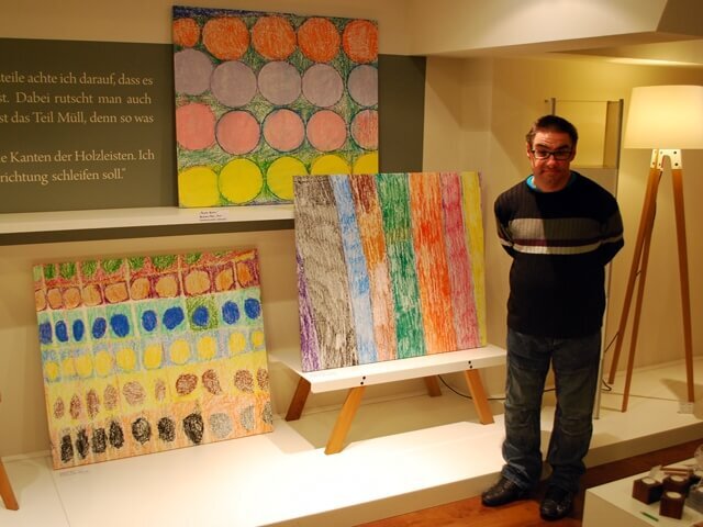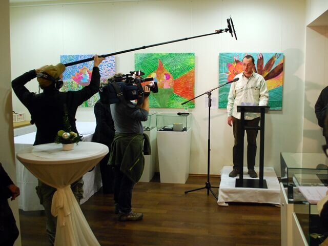 Wir fuhren am Donnerstag früh um 03:00 Uhr los und waren gegen 11:30 Uhr in Duisburg. Nachdem wir mit der Leiterin des Ars Vivendi, Frau Zabsky, die Ausstellung besprachen, hängten wir die Bilder auf. Am Donnerstagabend um 17:00 Uhr war die Eröffnung der Ausstellung. Zum Mittag gab es sehr leckeres Schwein vom Spieß. Die Eröffnung war gut und cool. Ein Kamerateam war auch vor Ort und Herr Jürgens und Herr Kronfoth mussten noch einige Fragen von einem regionalen Fernsehsender beantworten. Nachdem Frau Rogg, Geschäftsführerin der Duisburger Werkstätten, etwas zu der Ausstellung sagte, hatten wir die Gelegenheit, etwas zum Atelier und zu unseren Mitarbeitern zu sagen. Auch viele Privatpersonen hatten Fragen, die wir natürlich gern beantworteten. Wir haben gleich zu Beginn der Ausstellung zwei Bilder verkauft - das Teebild „Und Tschüß!“ von Beate Wurster und ein Stäbchenbild „Tagwerk Stäbchen“ von Anette Völker und Peter Pölsing.