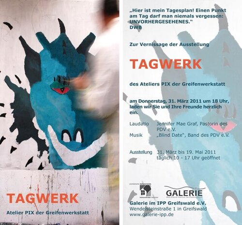 Das Atelier PIX der Greifenwerkstatt präsentiert tägliche Arbeit im Großformat. Am 31. März (Donnerstag) um 18 Uhr eröffnet mit der Ausstellung „TAGWERK“ eine große Bilderschau in der Galerie im IPP Greifswald. Der Titel nimmt dabei ebenso Bezug auf seine historische Überlieferung aus der Fresko-Malerei wie auf den Wert täglicher Arbeit eines jeden Einzelnen, die individuelle Bewertung von Arbeitsleistung, Tagesbewältigung und aktiver Lebensgestaltung. Gezeigt werden unter anderem 14 großformatige Produkte tagtäglicher Atelierarbeit.